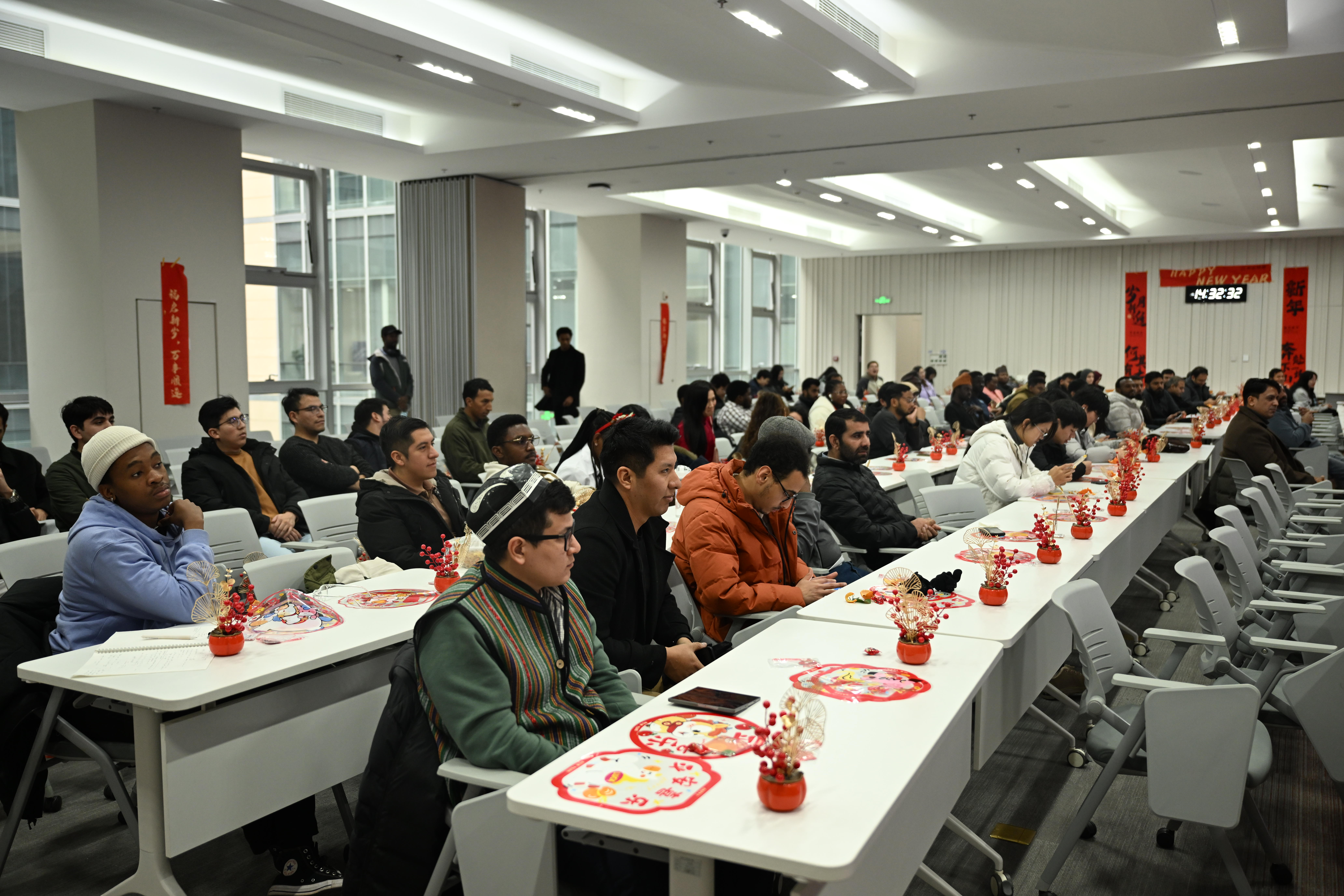 杨东凯教授在晚会现场发表简短致辞,并向同学们讲解了中国传统窗花的文化内涵与实际用途。他结合春节习俗,阐释了窗花所承载的美好寓意,帮助国际学生直观理解中国节庆文化,现场气氛融洽温馨。